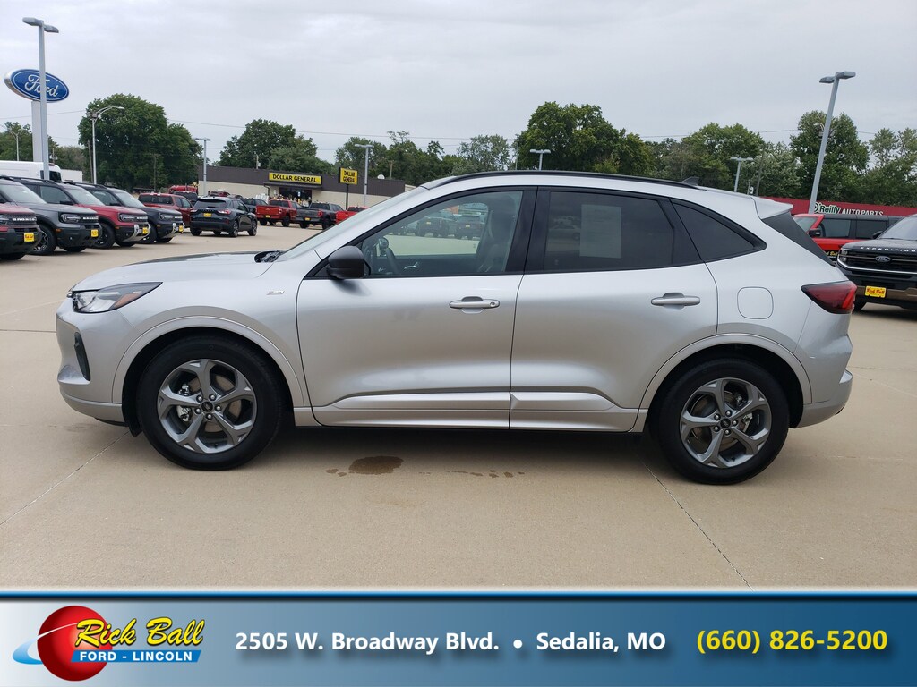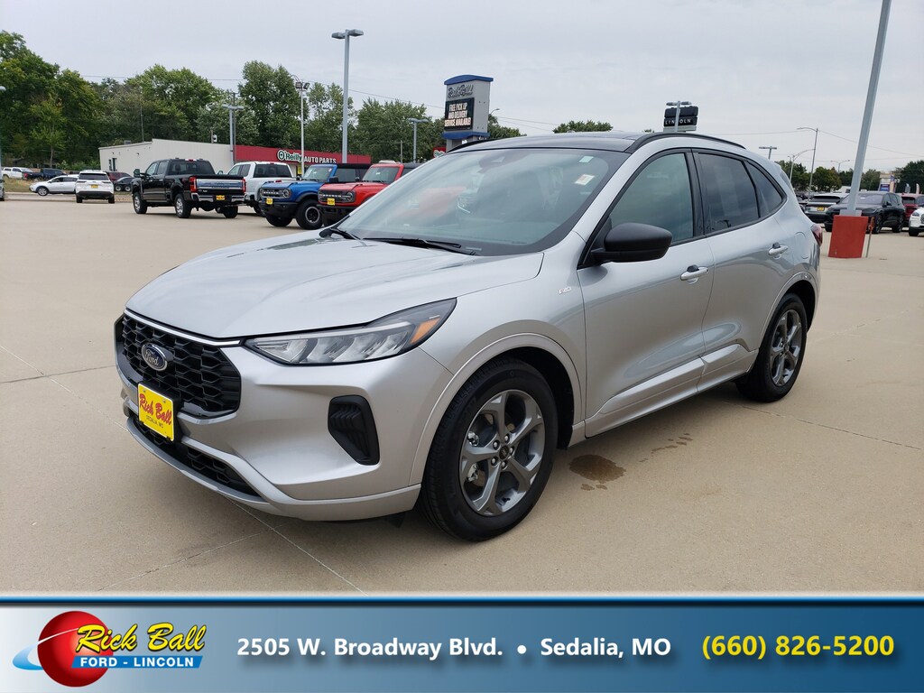 Check out this 2023 Ford Escape ST-Line. Its Automatic transmission and Intercooled Turbo Premium Unleaded I-3 1.5 L/91 engine will keep you going. This Ford Escape features the following options: ENGINE: 1.5L ECOBOOST -inc: auto start-stop technology (STD), Wing Spoiler, Wheels: 18" Rock Metallic Painted Aluminum, Vinyl/Cloth Front Sport Contour Bucket Seats -inc: 8-way power driver seat (includes fore/aft, up/down, power lumbar and power recline), 4-way manual front passenger seat (fore/aft w/manual recline) and red stitching, Valet Function, Trunk/Hatch Auto-Latch, Trip Computer, Transmission: 8-Speed Automatic, Transmission w/Driver Selectable Mode and Oil Cooler, and Tracker System. Stop by and visit us at Rick Ball Ford Lincoln Sedalia, 2505 West Broadway Boulevard, Sedalia, MO 65301.